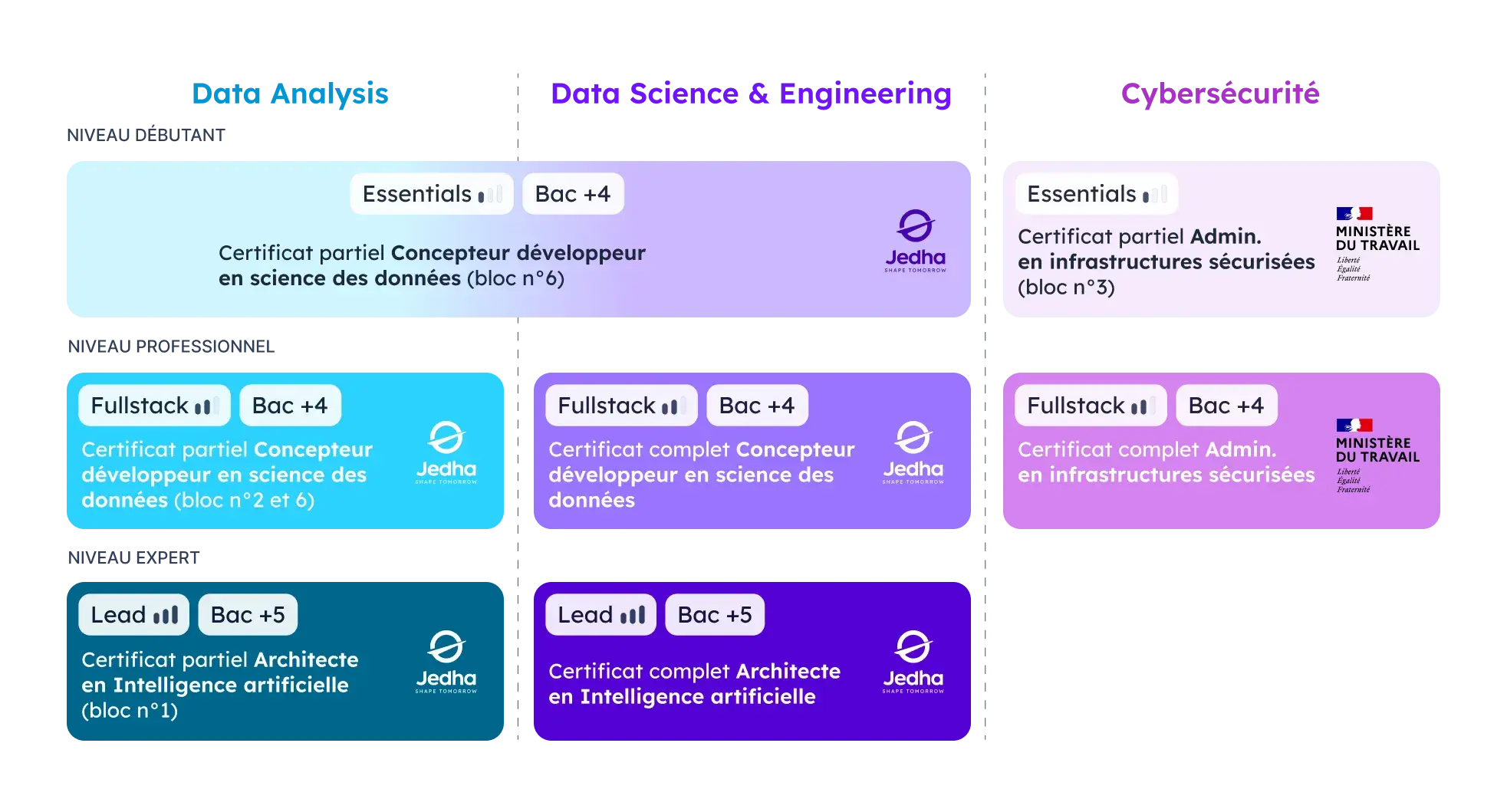 Les formations par niveau : Jedha propose un système unique de formation par niveau avec 3 paliers (Essentials, Fullstack, et Lead) qui s’adaptent à votre projet professionnel !