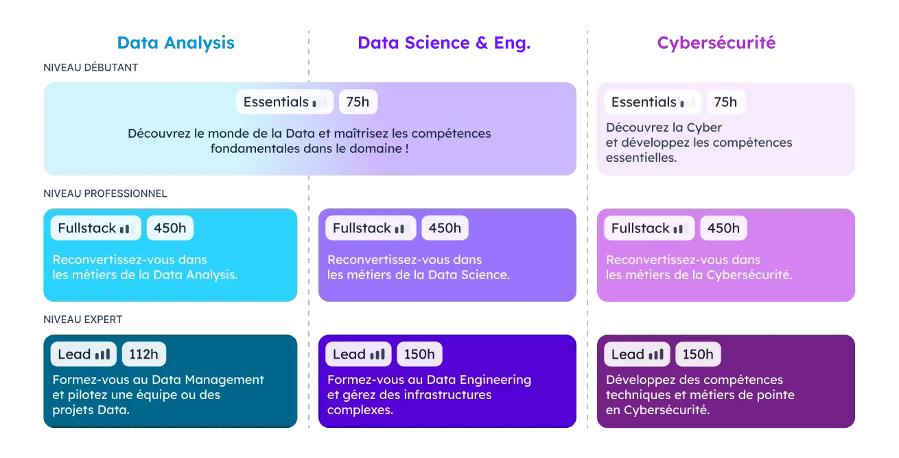 Pour rappel, chacun de nos parcours de formations Métiers (Data Analysis, Data Science & Engineering ou Cybersécurité) comporte 3 niveaux (Essentials, Fullstack et Lead) qui peuvent être combinées.