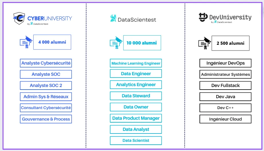 des formations métiers : pour devenir Data Scientist, Data Analyst, Data Engineer, Machine Learning Engineer, Administrateur Systèmes, Analyste Cybersécurité ou Ingénieur DevOps