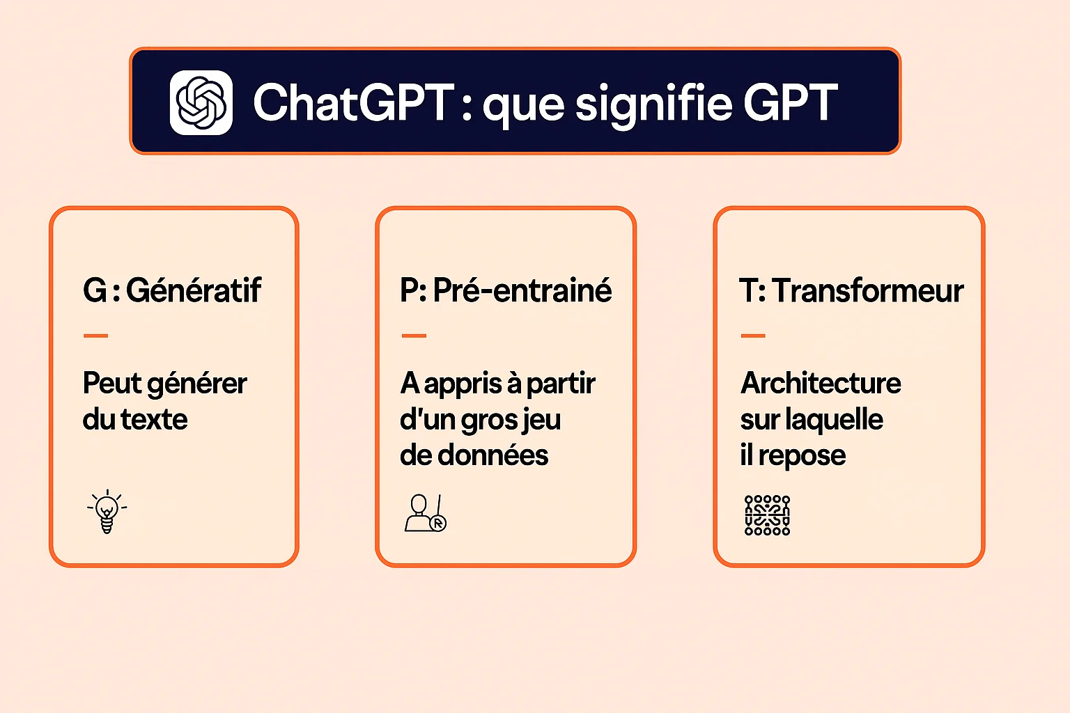 Vous vous êtes probablement déjà demandé pourquoi ChatGPT s’appelait « ChatGPT ». Si le début de ce nom se réfère à la qualité d’agent conversationnel de cette technologie, la fin, elle veut dire quoi ? Eh bien « GPT » est en réalité un acronyme qui signifie « Generative Pre-trained Transformer ». Continuez à lire pour découvrir les significations de ces mots 👇