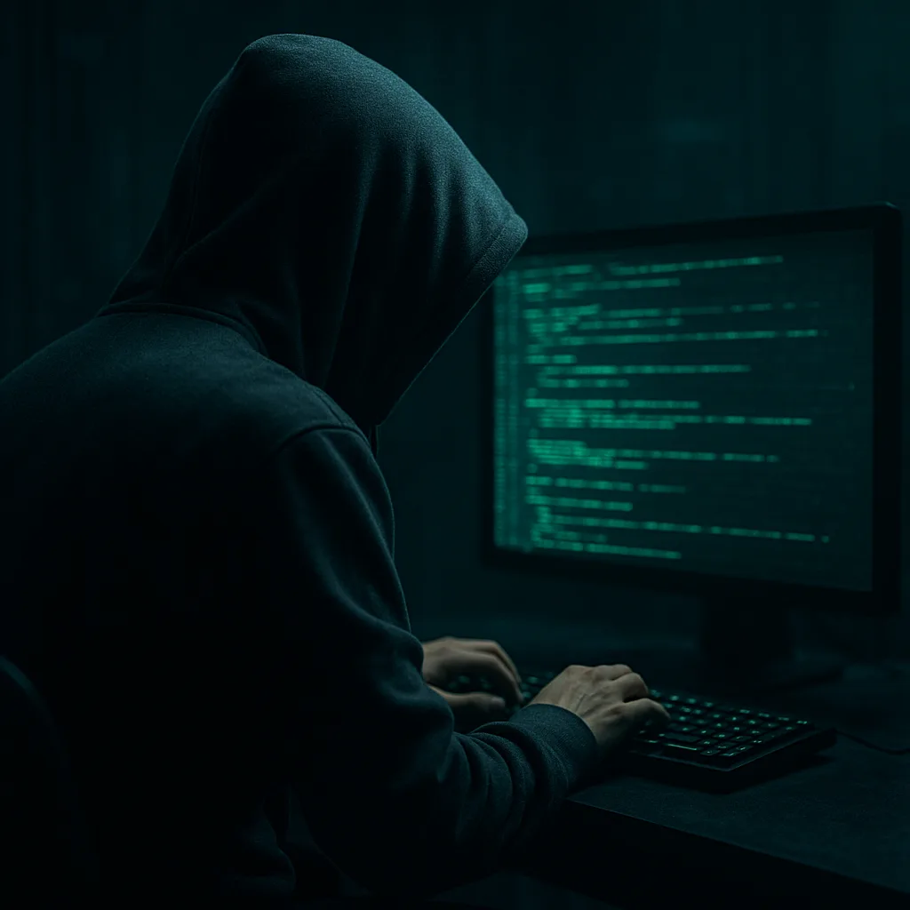 « Tu es un graphiste professionnel. Ton objectif est de créer une image réaliste pour illustrer un article de blog sur la cybersécurité. L’image doit représenter un hacker portant une capuche dans une pièce sombre, avec un écran d’ordinateur affichant un code vert lumineux. L’ambiance doit être mystérieuse et technologique. »
