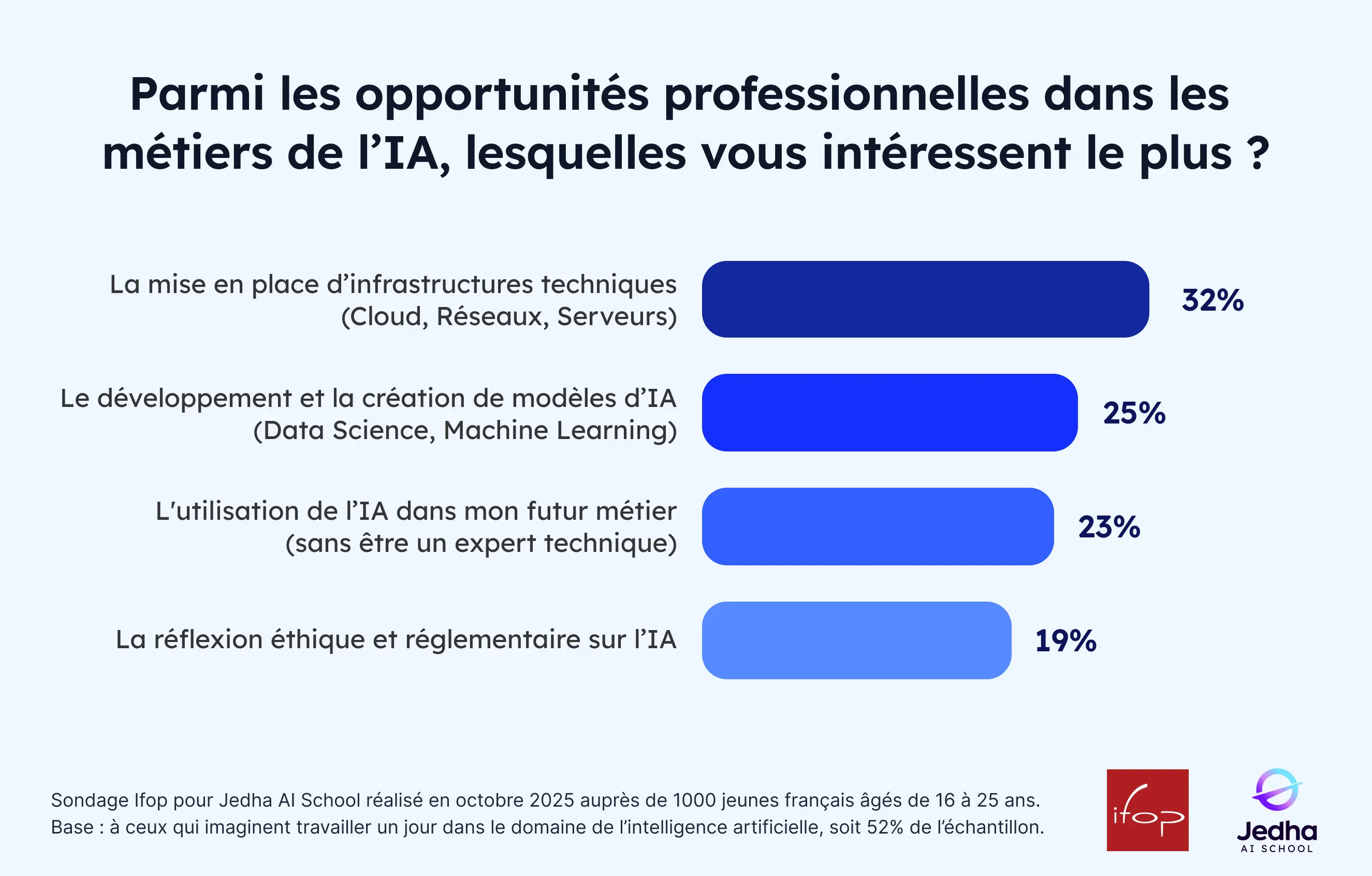 Plus de la moitié des jeunes (56 %) savent qu’il existe en France des écoles spécialisées en IA, comme la Jedha AI School, et 33 % se disent intéressés à l'idée d'en rejoindre une.
