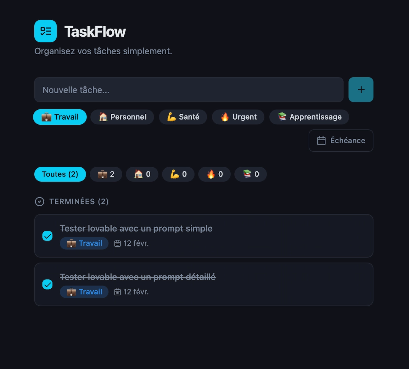 Et là, notre demande était bien plus précise puisque notre prompt était « crée une app de gestion de tâches avec catégories, dates d'échéance et thème sombre » :