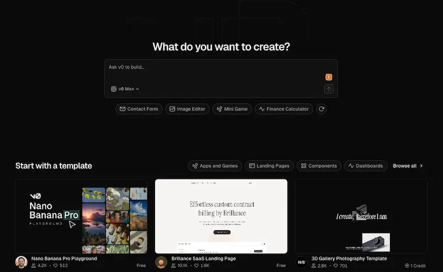 L’outil de vibe coding le plus adapté pour les designers est sans conteste v0 de Vercel, qui excelle dans la génération d’interfaces React professionnelles et prêtes à l'emploi.