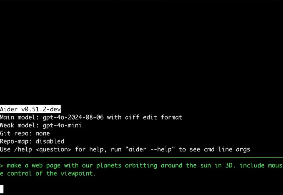 Comme Claude Code et Gemini CLI, Aider s'utilise directement depuis votre terminal où vous pourrez lui parler. Il s’adaptera alors à votre demande pour modifier les bons fichiers de votre projet, et générera même automatiquement des commits Git compréhensibles.