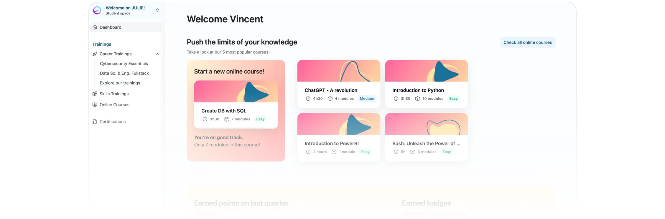 Apprendre est un jeu sur JULIE : gagnez des points et des badges au fil de votre avancée. Et si vous bloquez, l’équipe pédagogique vous contactera d'elle-même.